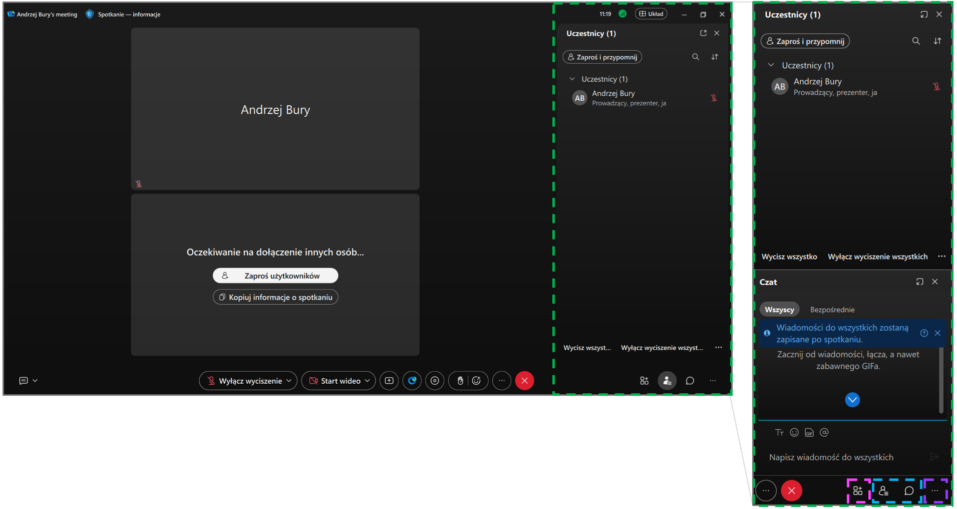 Następne dwa przyciski są najważniejszymi z tej grupy, odpowiadają one za otwieranie/zamykanie okien z listą uczestników (ikona sylwetki) oraz z ogólnym czatem spotkania (ikona komiksowego dymku). Pojawiają się tu opcje wyciszenia oraz odpowiadania poszczególnym bądź wszystkim uczestnikom.