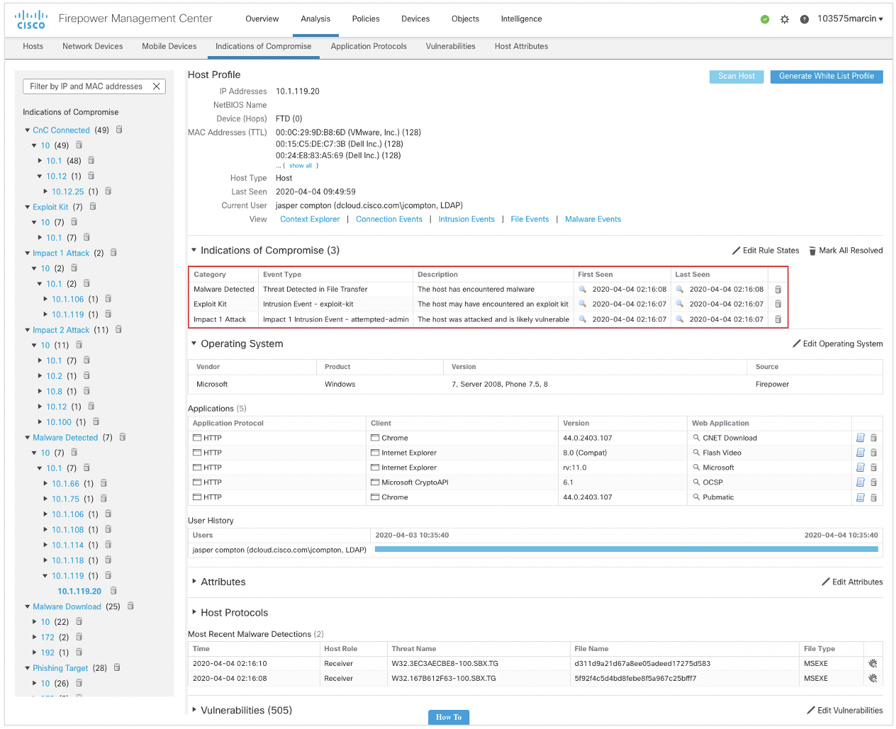 Po wejściu w widok urządzenia widać m.in. wykorzystywane przez niego aplikacje, zalogowanego użytkownika oraz dokładne przesłanki odnoszące się do oznak jego kompromitacji.