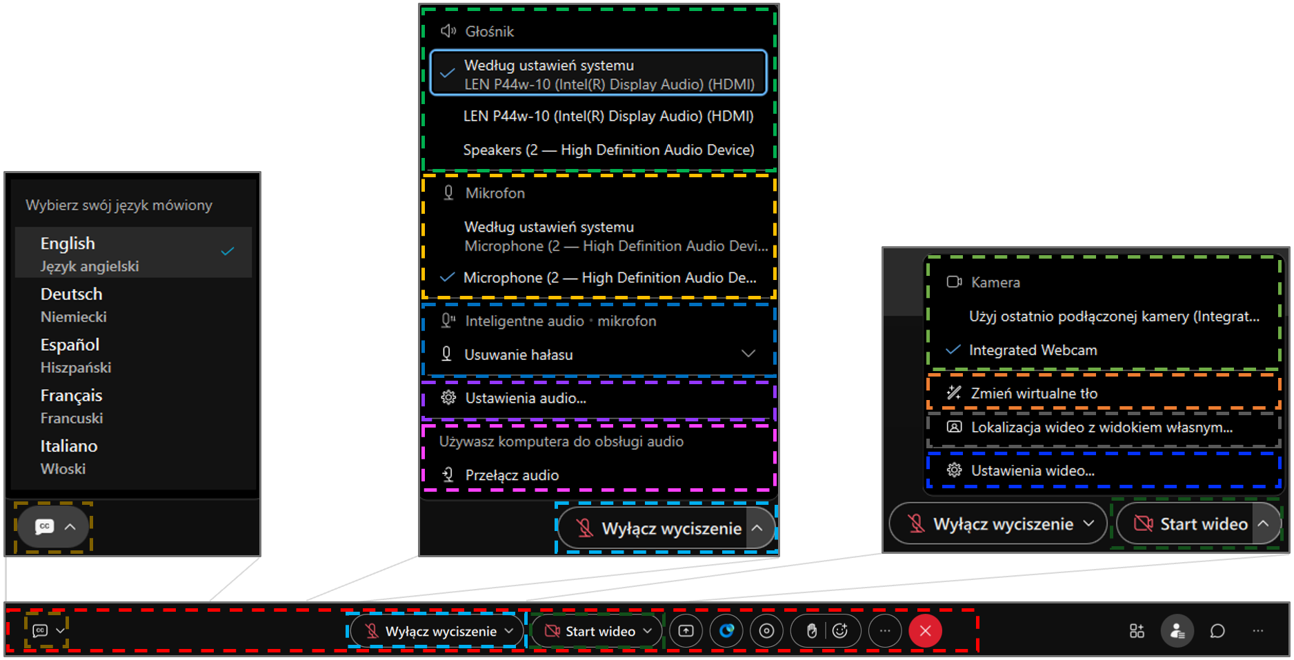 Po prawej stronie od przycisku Wyłącz wyciszenie znajduje się przycisk Start wideo, który również posiada rozwijalne menu w postaci strzałki umieszczonej zaraz obok tego przycisku. Pierwsza opcja w tym menu to wybór kamery, jaka ma być użyta w pokoju spotkania. Poniżej, opcja zmiany wirtualnego tła umożliwia dostosowanie tego co ma się wyświetlać w tle obrazu z kamery. Opcja Lokalizacja wideo z widokiem własnym pozwala na zmianę układu kafelków uczestników. Jako ostatni pokazuje się odnośnik do bardziej zaawansowanych ustawień wideo.